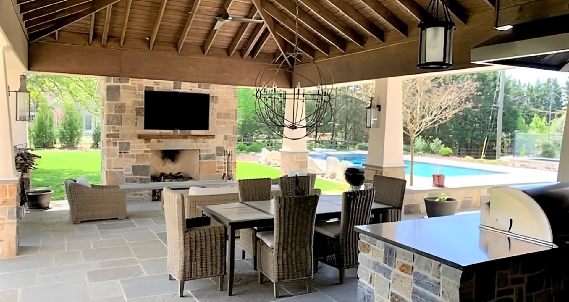 The most successful pool decks we design extend your indoor living space outdoors. Instead of just a deck around a pool, you get a complete outdoor room that works for dining, cooking, relaxing, and entertaining.